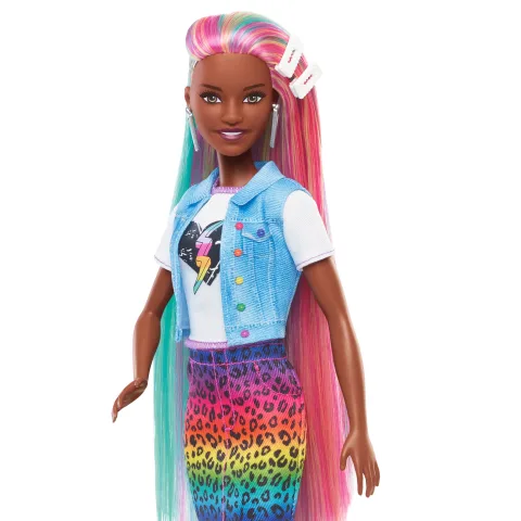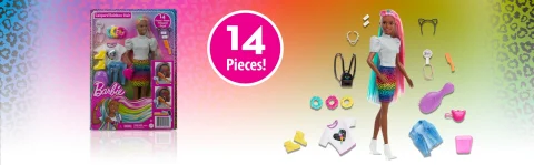 Children can have a blast with the Barbie Leopard Rainbow Hair doll, featuring vibrant, long rainbow-colored hair, a color-change function, and more than 14 fashion and hair accessories!