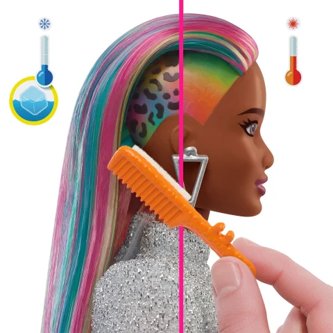 Barbie® doll loves exploring different colors and styles to find the perfect look! Kids can go "wild" playing with Barbie® Leopard Rainbow Hair doll's long rainbow-colored hair, color-change feature and over 14 fashion and hair accessories!Barbie® doll comes with fun fashion and hair play pieces to create multiple mix and match outfit combinations and all kinds of hairstyles!Activate the color-change feature on the side by using the comb to add cold water and watch a leopard print appear! Use warm water to make the leopard print disappear! So cool!With multiple hair play pieces to choose from, kids can become stylists and create different looks—including using scrunchies that work on Barbie® doll's hair. Barbie® doll can also wear the scrunchies as bracelets, too!