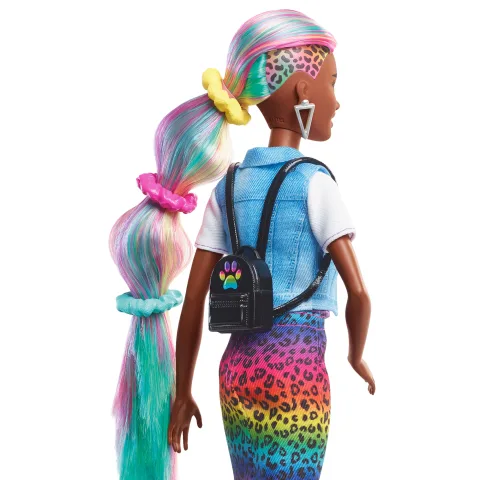 Barbie doll's fashion has no limits, and she loves experimenting with different colors and styles to find the perfect look! With the Barbie Leopard Rainbow Hair doll, kids can have fun brushing her long, rainbow-colored hair and reveal a stunning ombre effect. For extra excitement, they can activate the color-change feature by applying cold water to make a leopard print appear! The doll also comes with 16 accessories, including hair and fashion items, to create countless outfit combinations and hairstyles, including scrunchies that can be used in her hair. Barbie Leopard Rainbow Hair doll includes stylish items like 2 hairpins, 3 scrunchie bracelets, hair bands, a brush, a heart T-shirt, a jean vest, cat ears, a cat purse, a necklace, a backpack, an extra pair of shoes, a sponge wand for the color-change feature, and a container for ice water. Kids will enjoy endless creative play and styling possibilities! Doll cannot stand alone. Colors and decorations may vary. Ideal for kids aged 3 to 7.