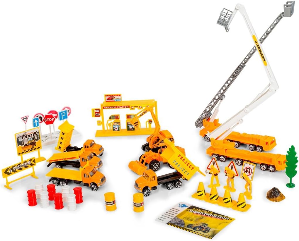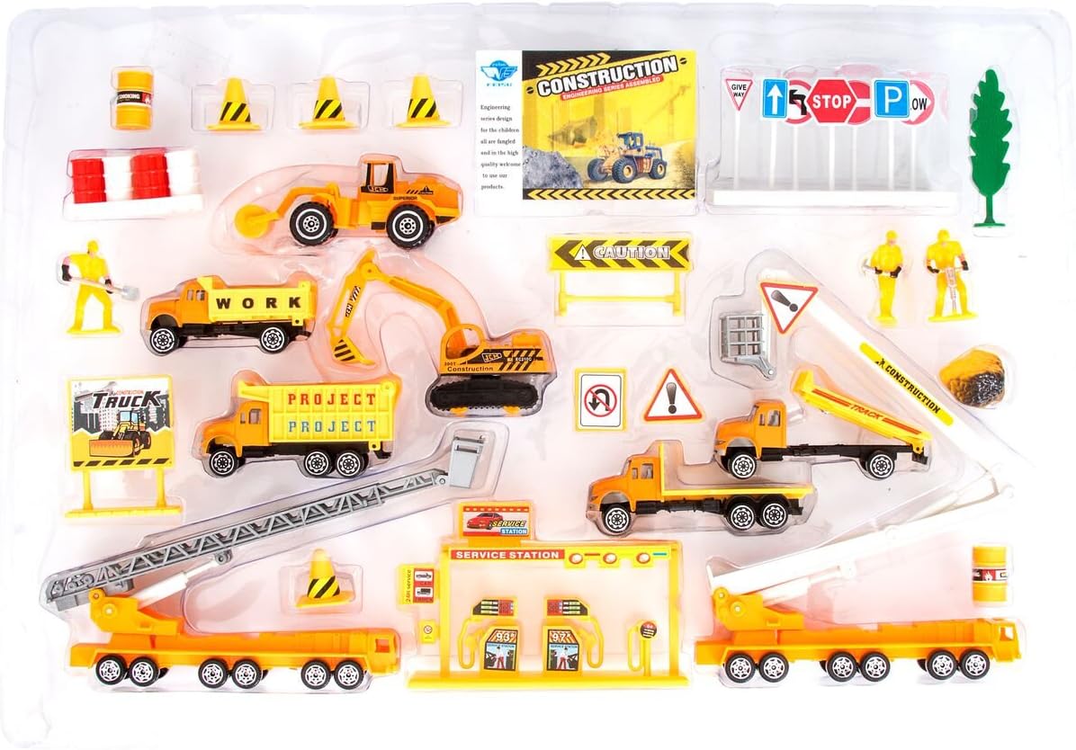 The BIG-DADDY CONSTRUCTION TOY SET has everything your child needs to build the ultimate construction site, including excavators, tractors, dump trucks, boom cranes, and a man lift truck. It also comes with workers and additional accessories. Made from durable Die Cast metal and plastic, the set is designed for long-lasting play, making it perfect for young builders. Suitable for children ages 3 and up, all pieces are non-toxic and lead-free. This construction playset serves as an educational tool, teaching kids how houses and streets are built, with all the essential personnel and equipment. Packed with all the necessary elements, it will keep your child entertained for hours, creating their very own construction site with everything from road barriers to a fuel station for refueling.