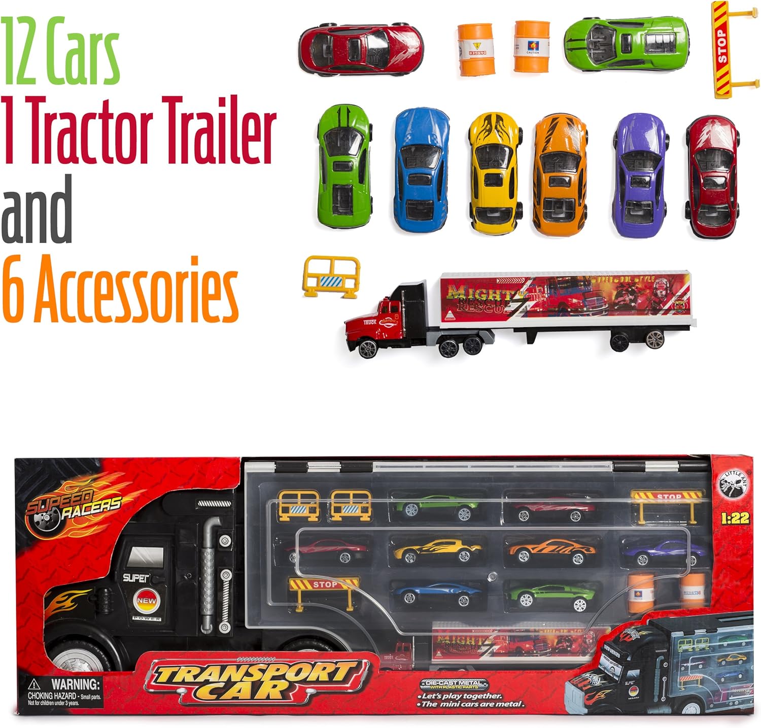 | This extra-large tractor trailer toy features multiple functions and comes with a variety of accessories such as traffic barrels, traffic barricades, 12 racecars, and a tractor trailer with a removable trailer for added play options. |